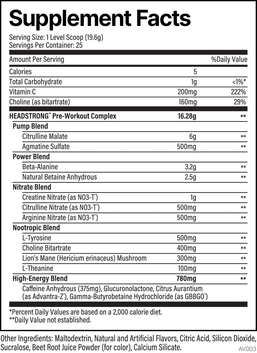 Headstrong's cutting-edge combination of powerhouse ingredients has everything you crave from a pre-workout supplement: pump, power, focus, and of course, energy for days! Your workouts will never be the same! Think you can handle it? Don’t think! Just do. Pick up a bottle of Headstrong today and get ready to have your mind blown and your body wrecked like never before during your next workout session.
